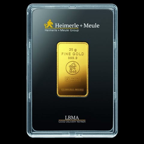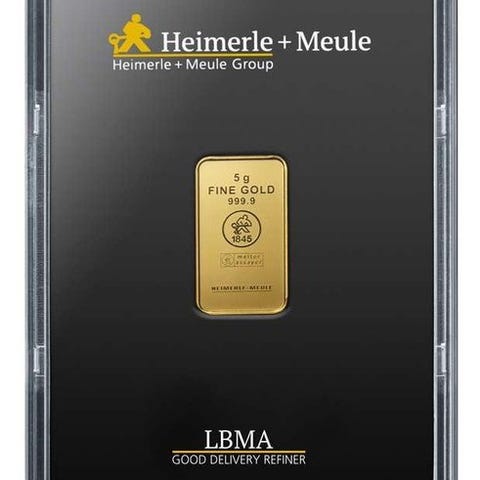 10 g guldbarre med finhed 999,9 fremstillet af Heimerle + Meule i Tyskland, LBMA-certificeret og forseglet i en plastkapsel. Klik på den blå "gå til varen" knap, for at købe eller byde på denne vare. Den samlede pris vil blive vist inden du afgiver dit bud.
