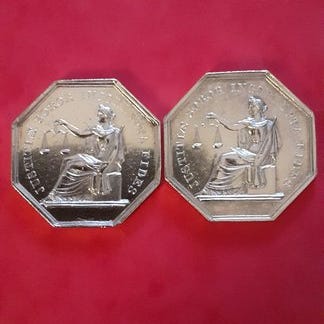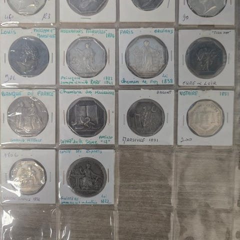 Fem genstande i loten: tre sølvjetoner, et kobberjeton og en sølmedalje, dateret fra Ancien Régime i Frankrig, herunder Louis XV-jetoner (1732, 1758) og en medalje fra Lyons Handelsret 1835. Klik på den blå "gå til varen" knap, for at købe eller byde på denne vare. Den samlede pris vil blive vist inden du afgiver dit bud.