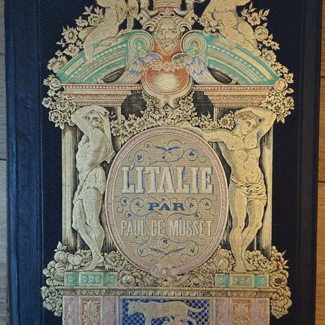 Rigt udsmykket med gyldne motiver i guld på for- og bagsiderne og på ryggen.