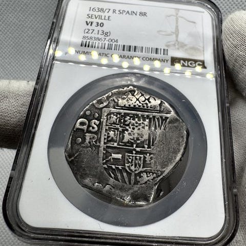 I begyndelsen af Felipe IV's regeringstid, midt i Den gyldne Tidsalder, fortsatte de peninsulanske møntsteder med at udstede det ikoniske reales de a ocho, mønten som cirkulerede i Europa og i Den Nye Verden som handelsstandard. Dette eksemplar fra 1622 tilskrives Sevilla, en af periodens store møntstæder, hvis