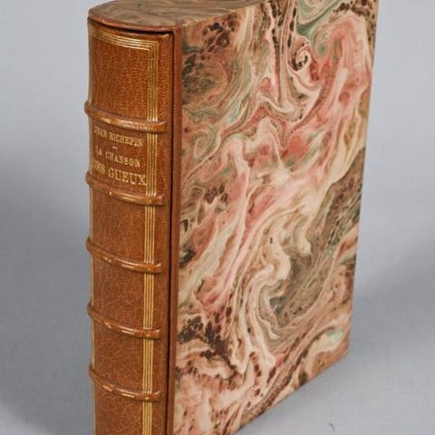 Bindet er dækket af fuldt maroquin i havanebrun, udført mesterligt af Lucien Magnin: