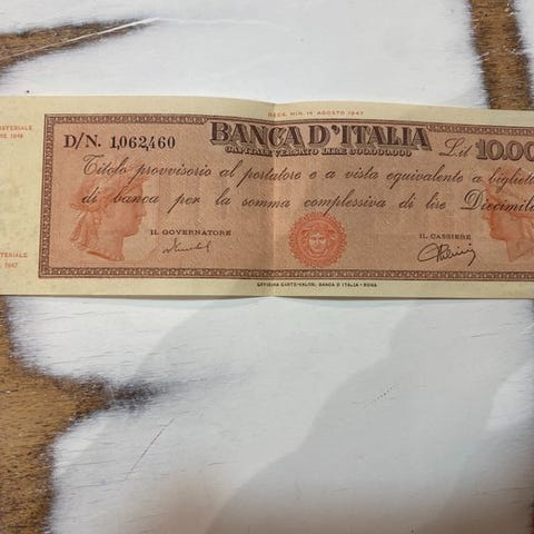 Provisorisk titel 10.000 lire, 17/12/1947. Ikke vurderet, men tilstanden er fremragende som vist på billedet.