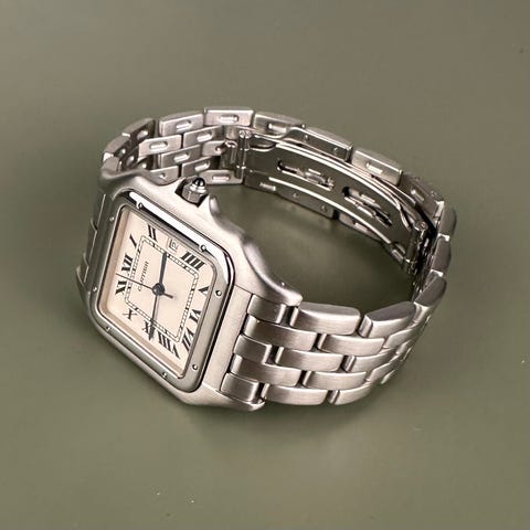 Cartier Panthère 1320, damesur i stål med kvartsur, 22 mm, periode 1990–1999, hvid/creme skive med let patina, stålbeslag (samlet længde 16 cm), original æske inkluderet, vandtæthed 30 m ikke garanteret, brugt i god stand med tegn på slid. Klik på den blå "gå til varen" knap, for at købe eller byde på denne vare. Den samlede pris vil blive vist inden du afgiver dit bud.