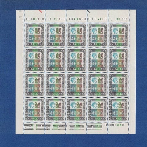 Sammensætning: Arket består af 6 eksemplarer af værdien 500 Lire hver, til en samlet pålydende værdi på 3.000 Lire (en meget høj sum for perioden).