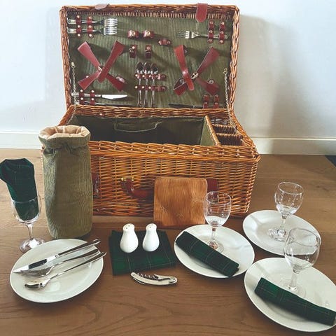 Foråret er på vej, dejligt at komme ud og nyde et måltid og en drink på farten? Så må denne luksus-picnickurv, der er egnet til 4 personer, ikke mangle.