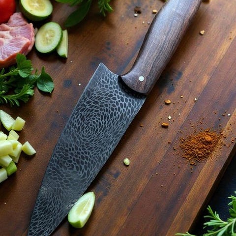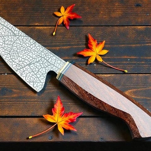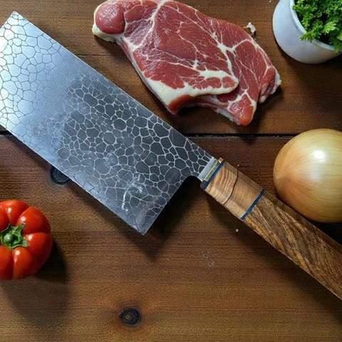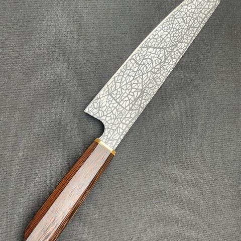 Forged kulstofstål eller højkarbon rustfrit stål med en kurouchi (sort smedie) finish på den øvre del — dette giver rustik karakter og en vis korrosionsmodstand.