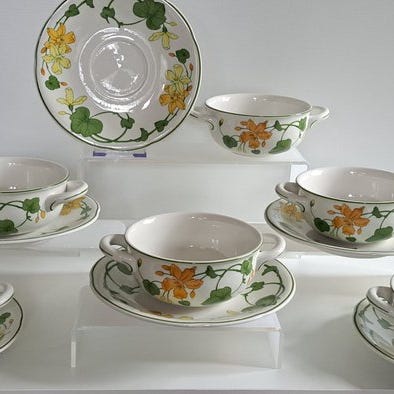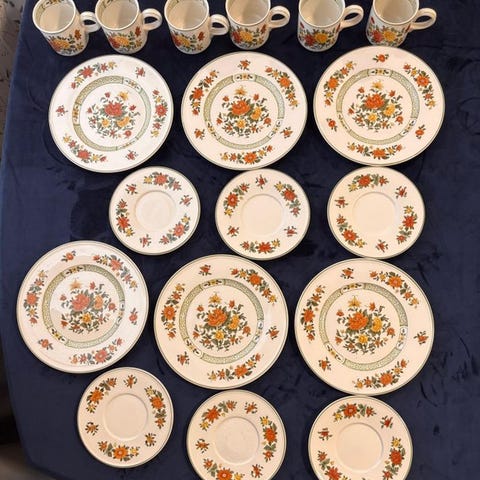 Jeg er glad for at præsentere et magnifikt og usædvanligt komplet middag- og te-service fra den verdenskendte tyske producent Villeroy & Boch. Samlingen "Summerday" er en tidløs klassiker, der forener tysk håndværk af høj kvalitet med en varm, rustik blomsterdekor inspireret af en blomstrende sommerhave.