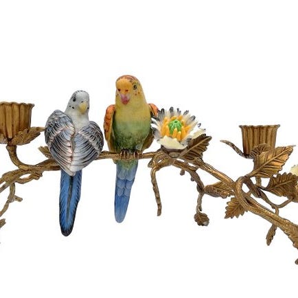 Disse imponerende papegøje-lysestageholdere, støbt af fin porcelæn og monteret på elegante bronzebaser, forener enestående kunsthåndværk med luksuriøs indretningsappel. Hvert stykke viser omhyggeligt skulpterede papegøjefigurer, suppleret med fine bronzebeklædninger, der giver dybde og raffinement til designet.
