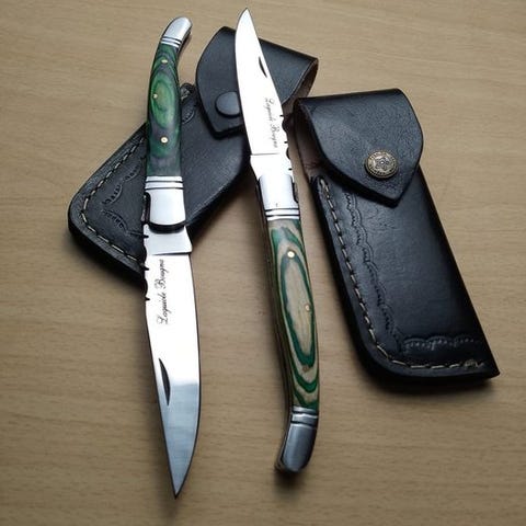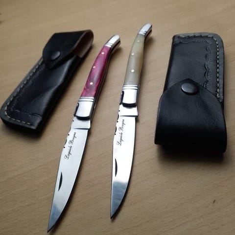 De tidlige 2000-tals 'Forged de Laguiole'-knive designet af K. Romain er et sjældent og udsøgt fund. Disse foldbare Laguiole-knive, omformet til køkkenknive, viser Romains unikke blanding af fransk kunsthåndværk og innovativt design. Hver kniv vidner om samarbejdet mellem Romain og Laguiole-mestrene, med indviklede mønstre og præcist udført håndværk. Den kompakte, foldbare konstruktion gør dem perfekte til daglige køkkenopgaver, mens deres sjældenhed og Romains kunstneriske præg gør dem til et eftertragtet samleobjekt. En unik fusion af tradition og modernitet, disse knive er en skat for kulinariske entusiaster og samlere. Begrænset udgave.