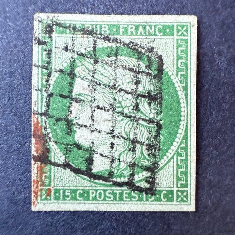 Fransk oprindelse, 15 øre Ceres med korrekte margener, afstempelt, 1850, Yvert 2, med ekspertsignatur Brun. Klik på den blå "gå til varen" knap, for at købe eller byde på denne vare. Den samlede pris vil blive vist inden du afgiver dit bud.