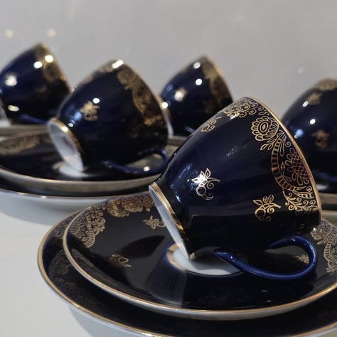 Koppen og skålen er HÅNDT MADRET. Dekoreret med 22-karat guld. Håndvask anbefales.