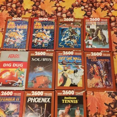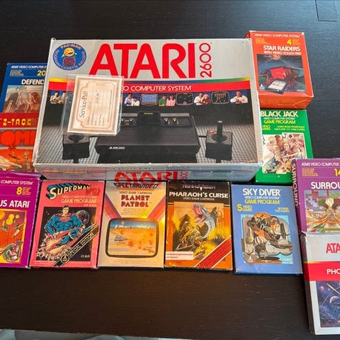 ATARI 2600 + spil, fremstilling 1984, i meget god stand, med kabler og to controllere, inklusiv seks spil: Missile Command, Defender, Centipede, Amidar, Battlezone og Pac-Man (uden emballage); købskvittering og manualer inkluderet. Klik på den blå "gå til varen" knap, for at købe eller byde på denne vare. Den samlede pris vil blive vist inden du afgiver dit bud.