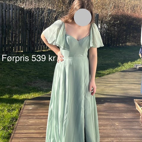 Til særlige lejligheder i størrelse XS. Grøn tyl med let, fyldig nederdel. Overdelen har tætsiddende pasform med stropper og v-udskæring foran og bagpå. Kjolen er velegnet til formelle anledninger som fester, konfirmation eller andre særlige lejligheder. kjolen er fra Azazie, men det måtte jeg ikke vælge.