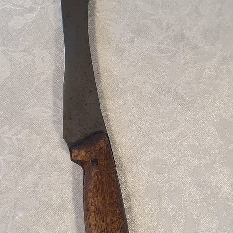 Fin franskbrødskniv med hvidt skaft og hul så den kan hænge. Totallængde ca. 31 cm. Skær ca. 19 cm langt. Fin og intakt.