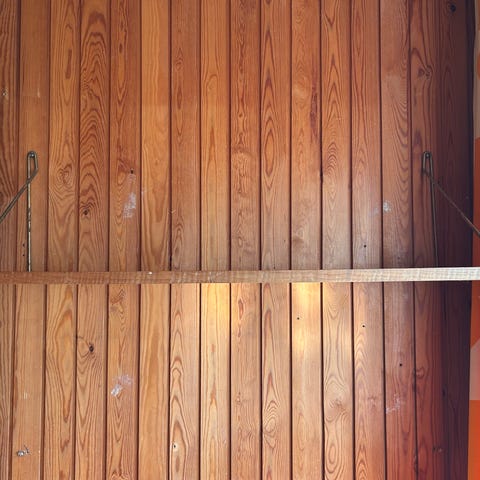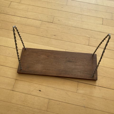 Super flotte retro teaktræ hylder med flotte messing bøjler og mere eller mindre patina.