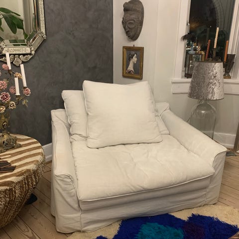 Sælger denne Sofastol i lys grå og med egetræsben, fra Ilva. Den er med koldskum og duntop, så det er fyldige puder og god kvalitet, så man sidder godt i den.