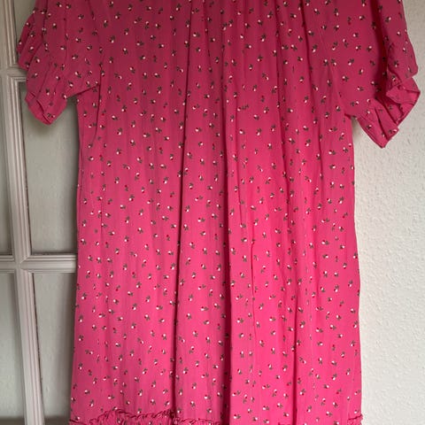 Rigtig pæn lille løshængende kjole sort bund med små orange/blå blomster. Har elastik ved halsen så den sidder perfekt, og elastik ved underkant af ærmer, og nederst på kjolen er den en flæse