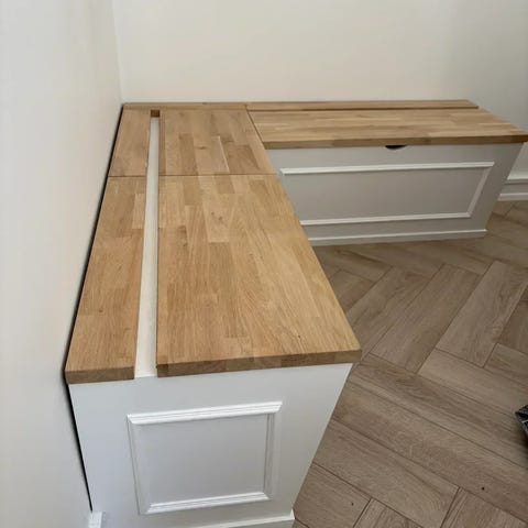 Fodlisten bliver bygget ind i bænken så den går helt ind til væggen. Bænken er med vippelåg og med valgfri ruminddeling.