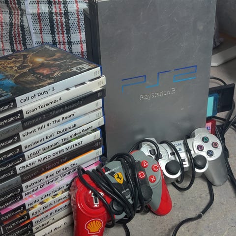 Sony PlayStation 2 konsol. Sættet omfatter en PlayStation 2 konsol med kablede controllere i forskellige farver og design. Der medfølger flere PlayStation 2-spil i originalæsker, herunder blandt andet racerspil, action- og adventurespil (titler fremgår af billederne). Der ses også en PS2 til HDMI-adapter til tilslutning til nyere tv med HDMI-indgang. Velegnet til brug med fysiske PS2-spil og lokal multiplayer med flere controllere.