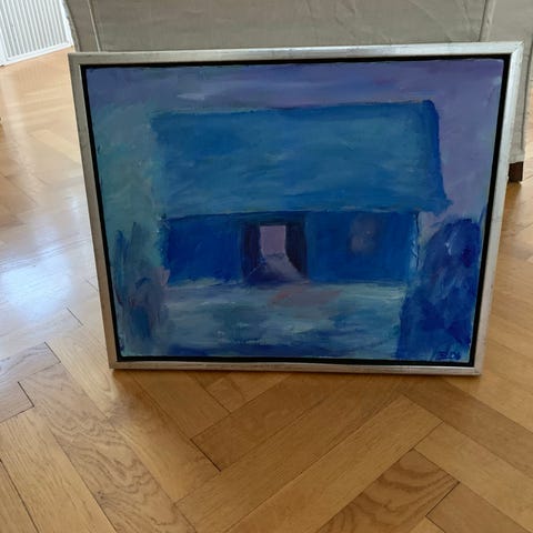 Stort Abstrakt maleri på lærred i rektangulær sølv farvet svæveramme