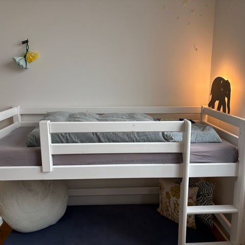 Hoppekids højseng i hvidmalet træ. Sengen har sengehest hele vejen rundt samt integreret stige i den ene ende. Under sengen er der god plads til opbevaring eller leg. Det ene bræt har været knækket men er repareret med et støttebræt. Madras kan medfølge og koster 100kr. Det er en kapok madras.