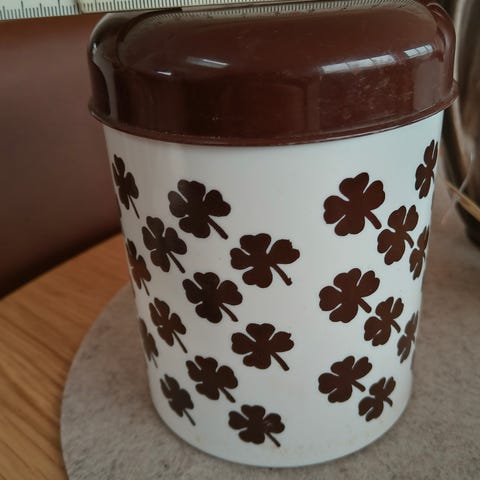 Boksen er natur og låget er mørkt farvet.