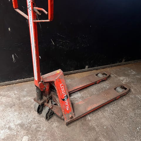 Silverstone halvpalleløfter i rød. Manuel palleløfter med håndtag og gaffelben til løft og flytning af paller i værksted, lager eller garage. Kan løfte halve EUR-paller og lignende paller. Robust konstruktion med styrehjul og gaffelhjul for nem manøvrering på faste underlag.