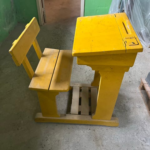 Meget fin skolepult med oplukkelig skriveklap, pennerille med pen, det originale blækhus i glas samt en lodret hylde til bøger forrest på møblet. Pulten kan forskydes frem og tilbage, alt efter elevens størrelse. Pulten kommer fra et gods på Sjælland.