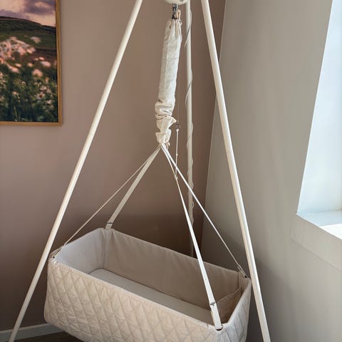 Moonboon Oval vugge, Vi sælger det med stativ og himmel. Vores lille dreng er blevet for lang og kan ikke være i den længere.