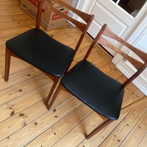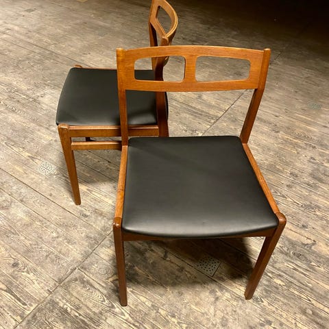 2 stk’s meget flotte spisebordsstole med stel af massivt teaktræ, rygstykke af formbøjet finéret teaktræ, sæder betrukket med imiteret læder.