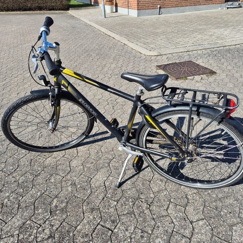 Den har 26" hjul og 16 gear. Cyklen har stel med lav indstigning, forgaffel med affjedring, skivebremse foran og bagpå. Den er udstyret med skærme, bagagebærer, lås, støttefod og for- og baglygte. 2 nøgler medfølger. Sælges fordi vores pige skal over på en voksencykel.