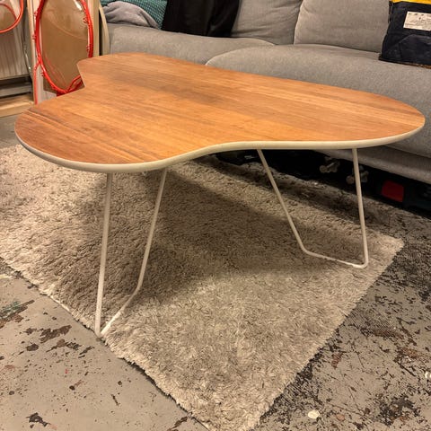 Flot design -sofabord:"hjertebord " fra anton dam møbelforretning. Bordet er fremstillet på Haslev møbelfabrik og er designet som et hjerte - deraf navnet ( hjertebord). Det er massivt træ og meget tungt/solidt og kræver god plads. (trænger til frisk ny maling).
