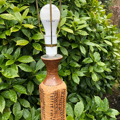 Søgeord: Bordlampe, gulvlampe, lampe, keramik, tysk, Bauhause, firkant. firkantet. mønstre, brun, gå, hvid, beige.