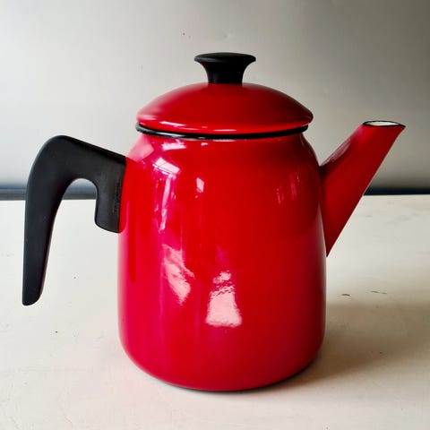 Flot Vintage Kaffekande i mørkerød emalje fra Kockum Sweden i rigtig fin stand udvendig og indvendig, med sort håndtag og knoplåg med mindre fejl og afslag på indersiden af lågkanten se foto.