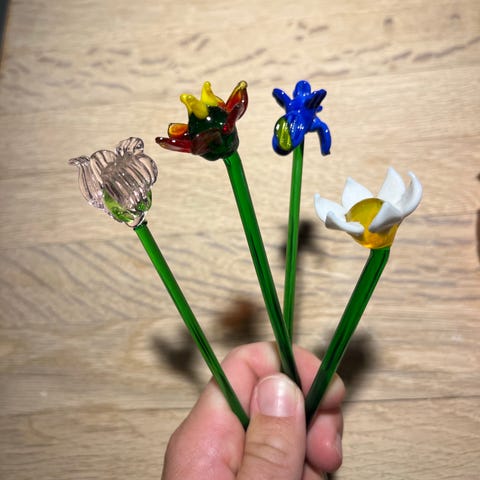 Blomst med stilk og blade lavet af flerfarvet glas. Monteret på metalstang og metalfod.