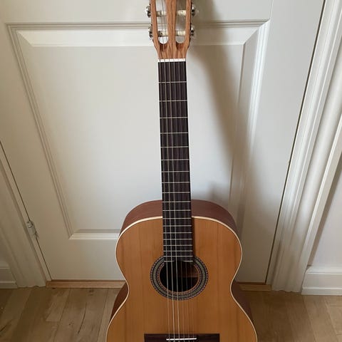 Jeg har opgraderet den med justeret bro og nye strenge, så den har lavere action og bedre spilbarhed end standardmodellen – en klar fordel, da mange oplever originalen som lidt høj i strengene.