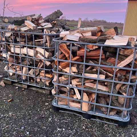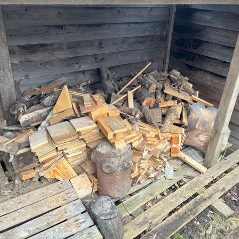 - 1 stablet brændebunke med savet og kløvet træ. Stået i ca. 4 år. Omkring 1,75 rummeter.
