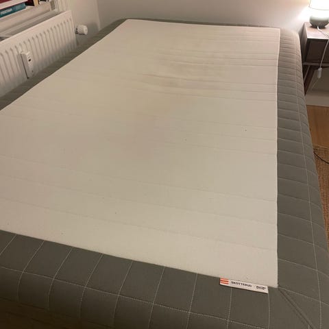 IKEA Skårer seng i grå tekstil. Brugt, men fejler ikke noget. Medfølger sølv metalben, og hvis det ønskes kan man også få brugt topmadras med gratis.