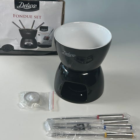 Summerbird chokoladefondue sæt i hvid. Sættet består af en skål til smeltning af chokolade med plads til fyrfadslys under, som holder chokoladen varm. Egnet til fx jordbær, frugt og andre små snacks, der kan dyppes i smeltet chokolade. Velegnet til servering ved dessert eller hyggearrangementer.