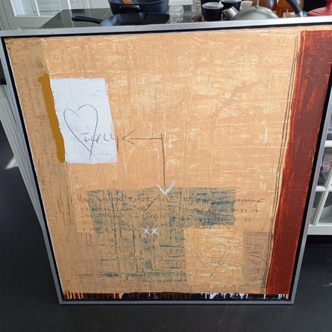 Abstrakt maleri med komposition i primært grå, sorte, røde og hvide nuancer. Værket er opdelt i felter med både malede og tegnede elementer, herunder linjer, former og tekstlignende markeringer. Maleriet er monteret i ramme og egner sig til ophængning i stue, kontor eller andre opholdsrum, hvor man ønsker et moderne, abstrakt udtryk på væggen.