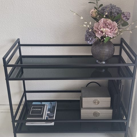 Norma rullebord i et elegant design, lavet af metal og hylder i glas.