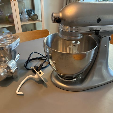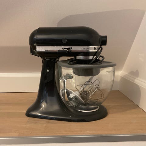 KitchenAid Artisan røremaskine i sort med skål i rustfrit stål. Maskinen har hastighedsregulering på siden og vippehoved til nem montering af tilbehør. Egnet til æltning af dej, piskning og blanding af ingredienser i køkkenet. Skålen har håndtag for bedre greb under brug og aftagning.