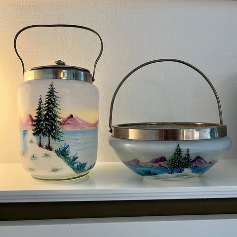 Smuk vintage kiksespand med låg. Klassisk i glas bemalet med flot motiv og skønne nuancer. 18 cm høj (24 cm høj til toppen af hanken) / 11 cm i diameter i åbningen. Fin stand - ingen revner eller skår. Har også en skål i samme stil - se selvstændig annonce. Sender gerne. Du kan også hente i Fredensborg eller København.