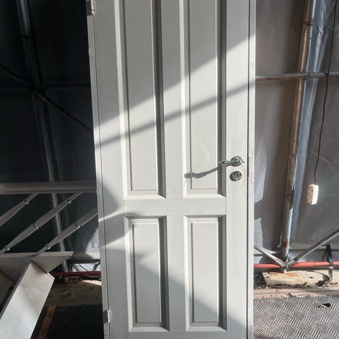 Indvendig fyldningsdør i hvid farve med tre fyldninger. Døren er udstyret med dørgreb og låsekasse. Velegnet som indvendig dør i bolig, f.eks. til værelse, gang eller kontor. Materialet fremstår som malet træ eller trækomposit. Swedoor hængsel. 62,5 x 203 cm.