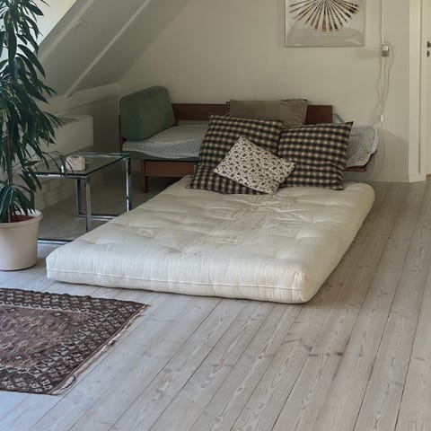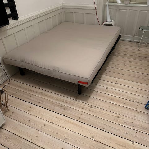 God komfort, men lidt plettet betræk. Udslået 140x200 cm.
