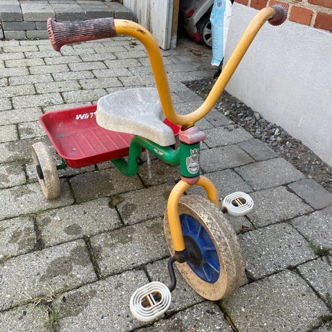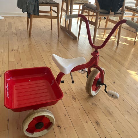 Winther trehjulet cykel med 10" hjul i rød farve. Cyklen har tre hjul, faste pedaler på forhjulet og et sæde med ryglæn. Bagpå er der en åben ladkasse til transport af legetøj eller andre småting. Egnet til mindre børn, der skal øve balance og pedalkørsel på en stabil cykel.