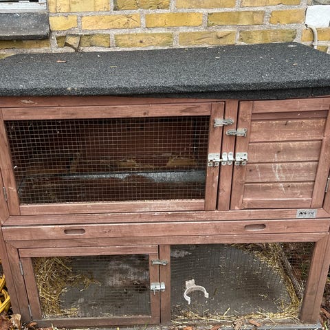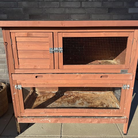 Træ kaninbur med to etager og netdøre. Funktionelt men slidt