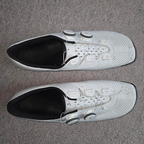 Ventoux cykelsko i hvid med sorte og røde detaljer. Skoene er designet til brug med klikpedaler og har stiv sål med monterede klamper på undersiden. Lukning med spænde og velcrostropper for justerbar pasform. Størrelse EU 40 ifølge oplysning, mærket i skoen viser EU 42. Velegnet til landevejscykling eller spinning, hvor der anvendes kliksko.