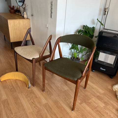 klassisk dansk spisebordsstol med armlæn. mulige modeller og designere: Kai Kristiansen (Model 32 / Model 31)