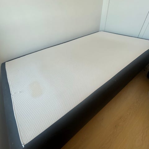 Jysk seng i grå farve. Sengen har en rektangulær liggeflade og står på ben. Mangler topmadras